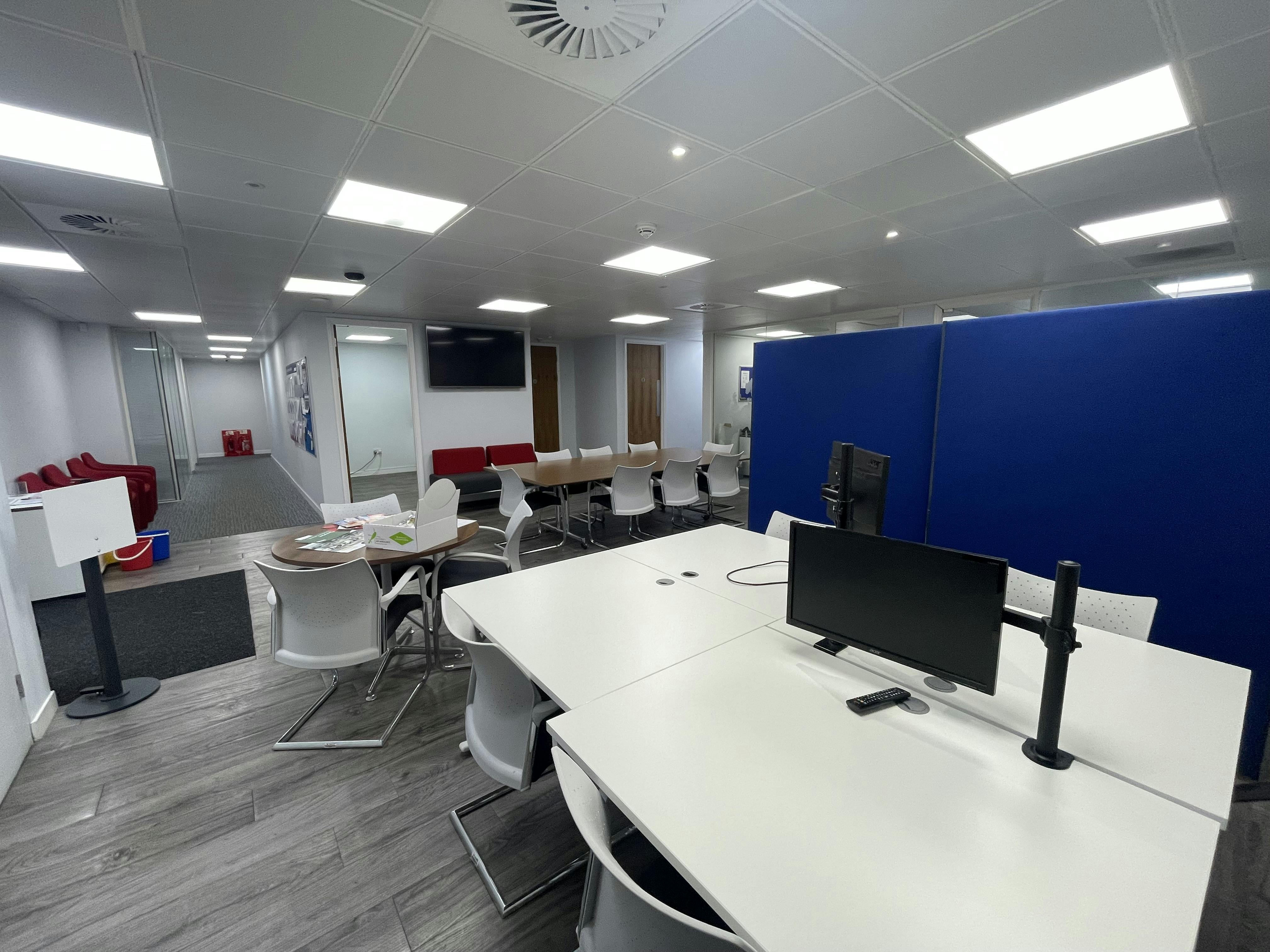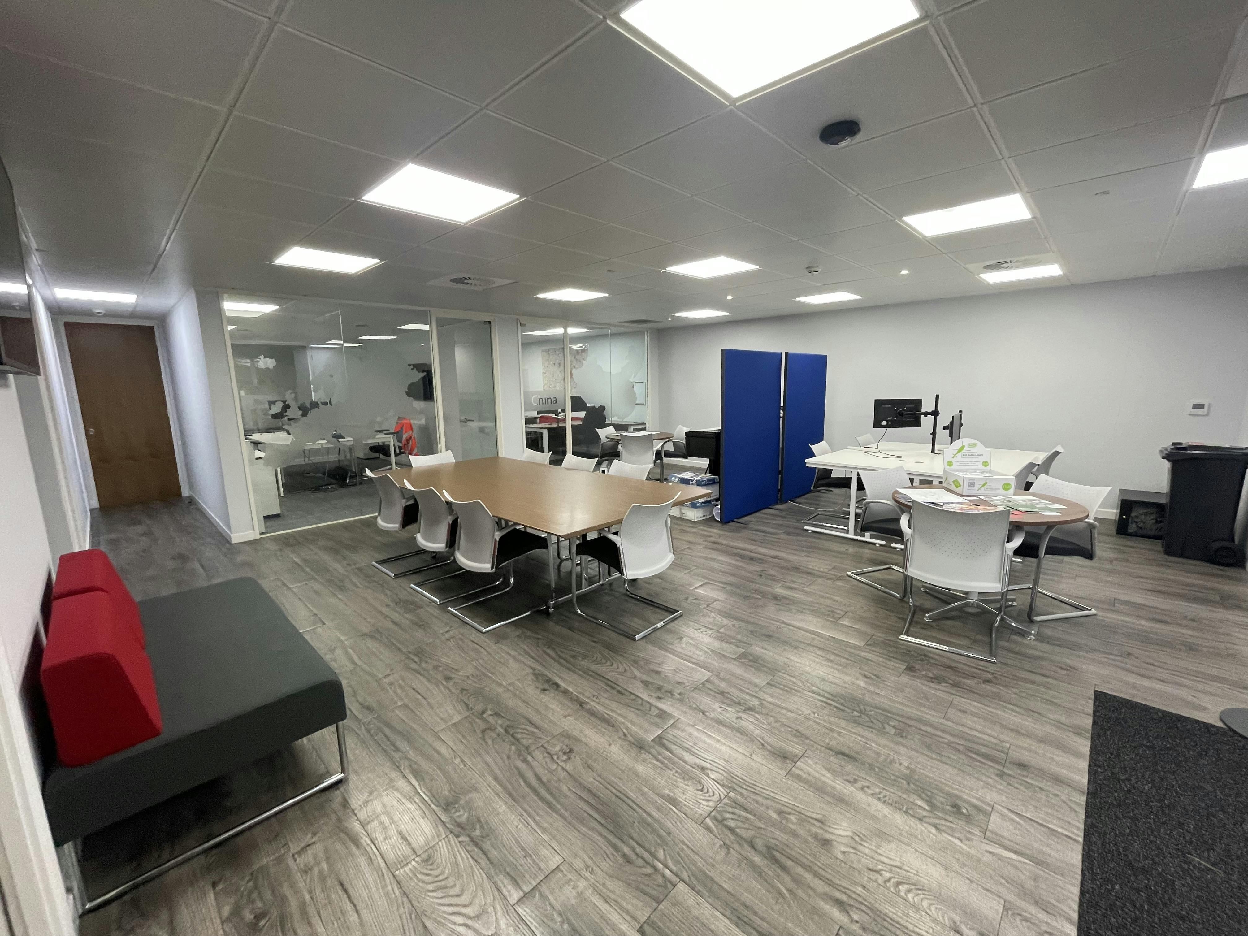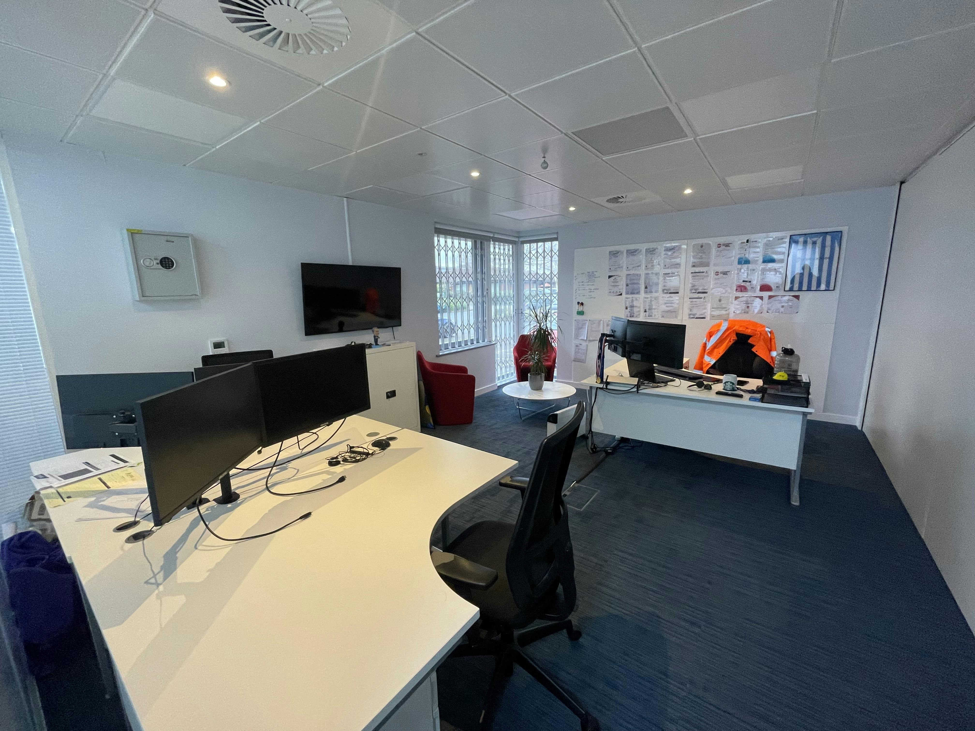 The property comprises a spacious entrance reception area with two offices, along with kitchen and WC facilities accessed directly from the reception. A central hallway provides access to further offices and leads through to the main office hub. The main open plan office includes a number of smaller offices to either side, together with a utility room and a boardroom. Further benefits include air conditioning fitted throughout, LED lighting, double glazed windows and parking spaces for 20 vehicles.